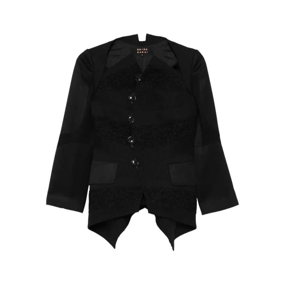 чёрный, фактурные панели, застёжка на пуговицы, передние карманы, заострённый подол, длинные рукава
