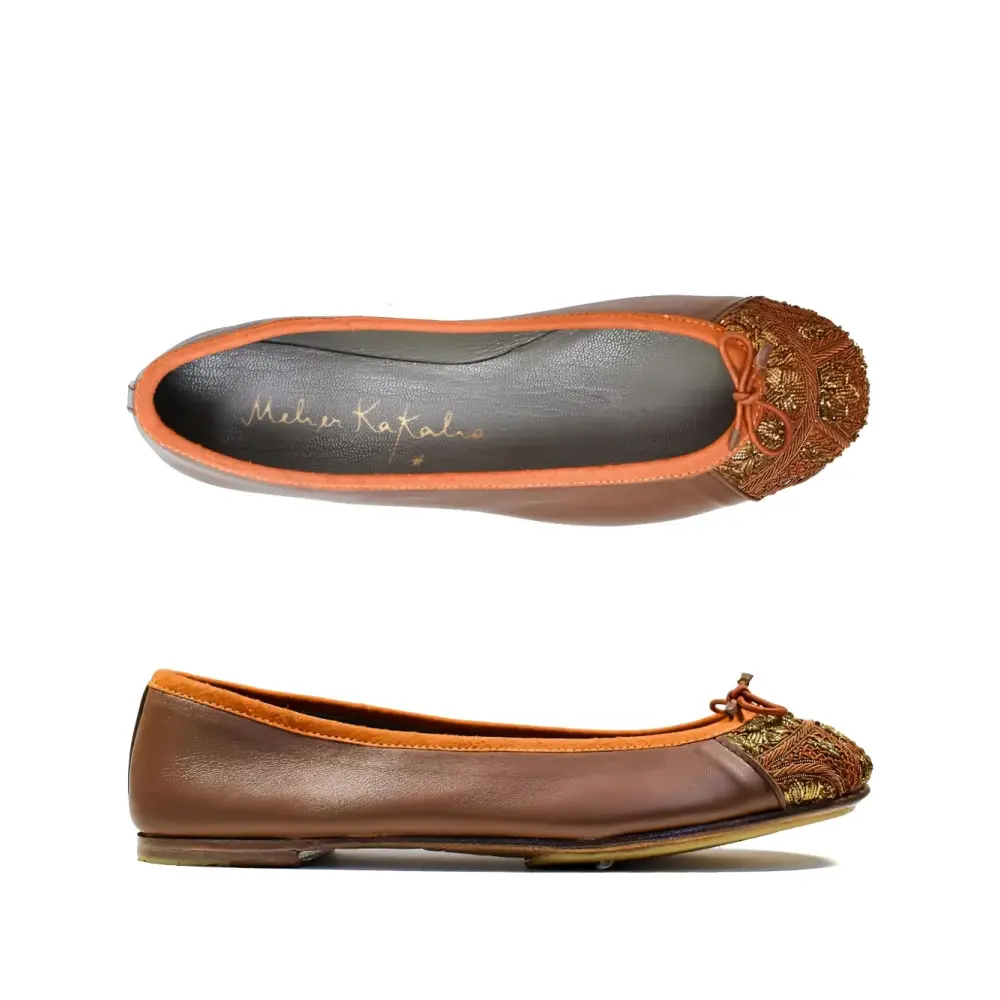 коричневые балетки с вышивкой на мысе, бантиком, плоской подошвой, круглым носком и контрастной отделкой