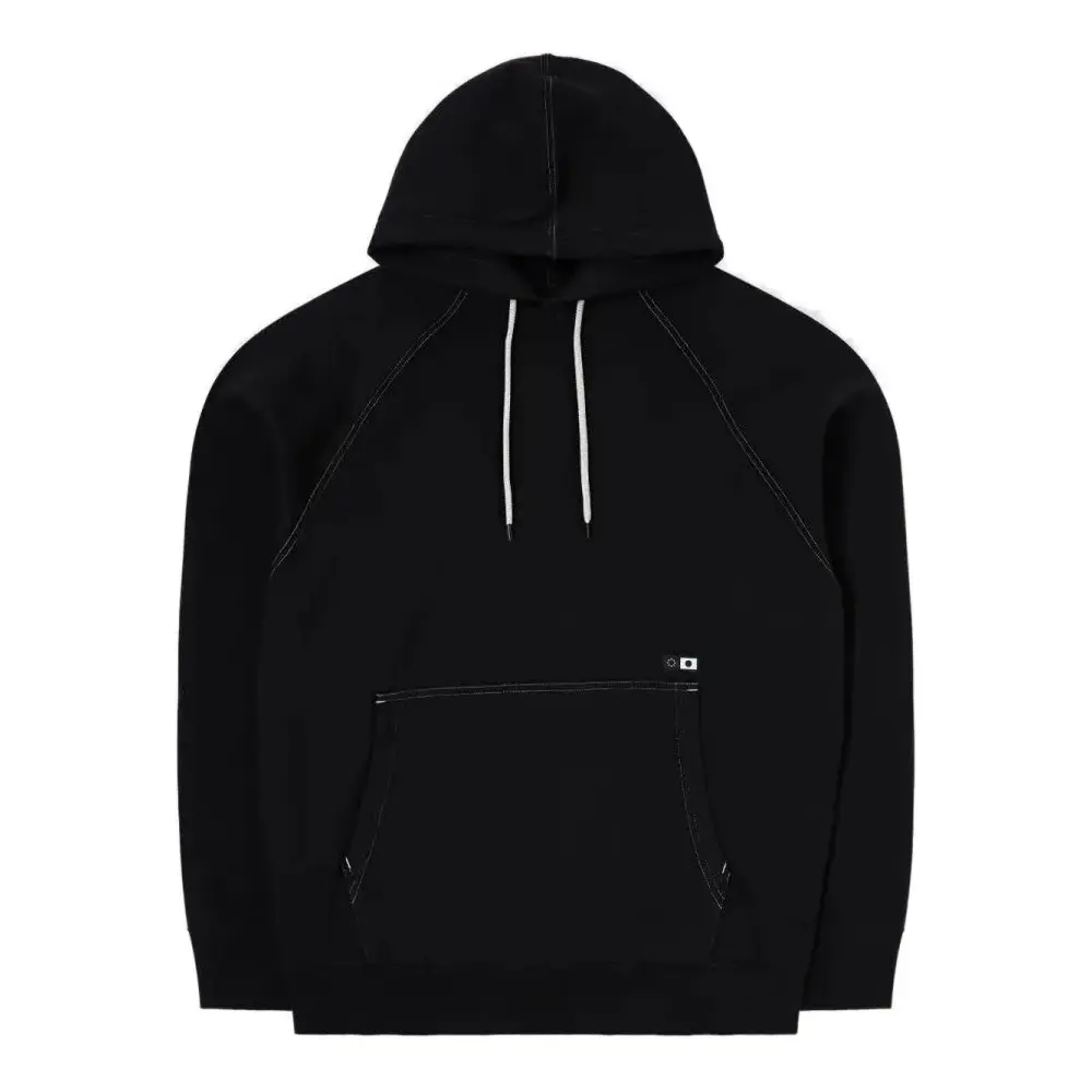 черная толстовка с капюшоном, шнурком, карманом-кенгуру и контрастной строчкой