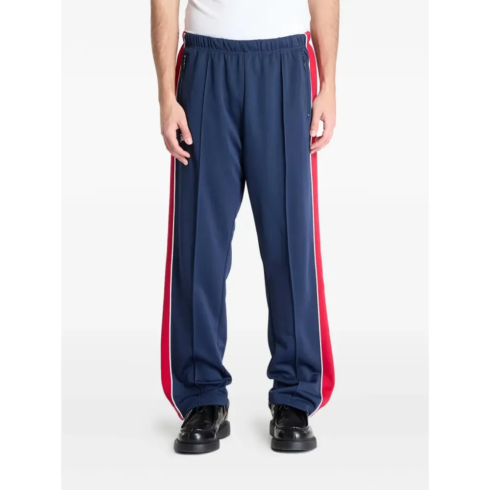 синие брюки с боковыми полосками, молнией, эластичным поясом, задним карманом на молнии, прямые брючины