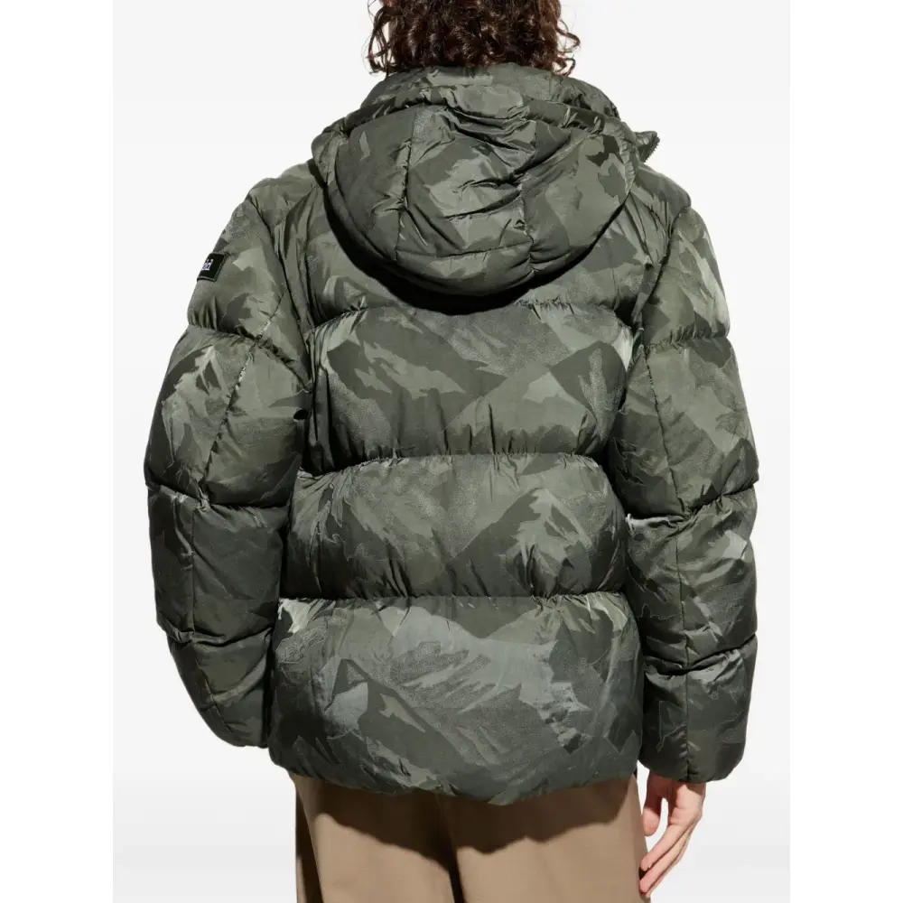 зелёная куртка с камуфляжным принтом, застёжкой-молнией, капюшоном, карманами на молнии и стёганым дизайном