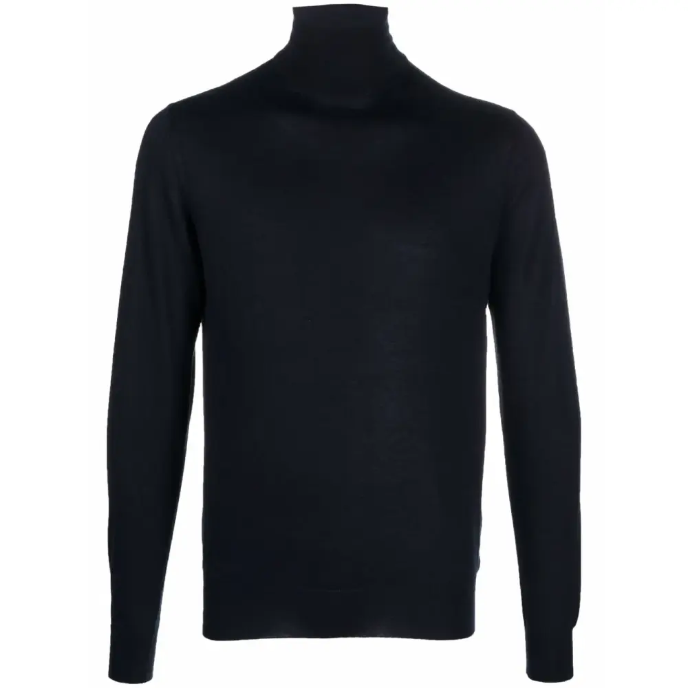 Тонкая вязка, высокий воротник, длинные рукава и прямой подол.