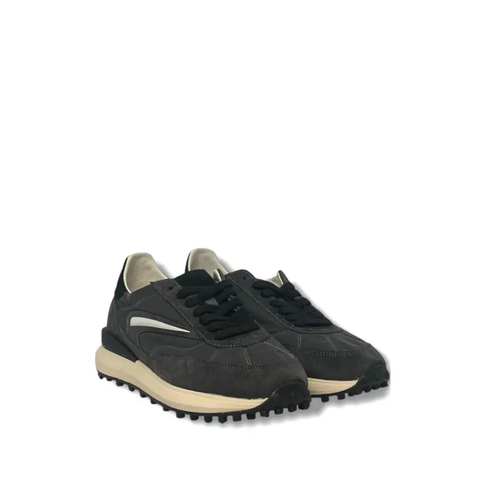 антрацитово-серый цвет, панельный дизайн, логотип с полосой, шнуровка, круглый носок, рифленая подошва