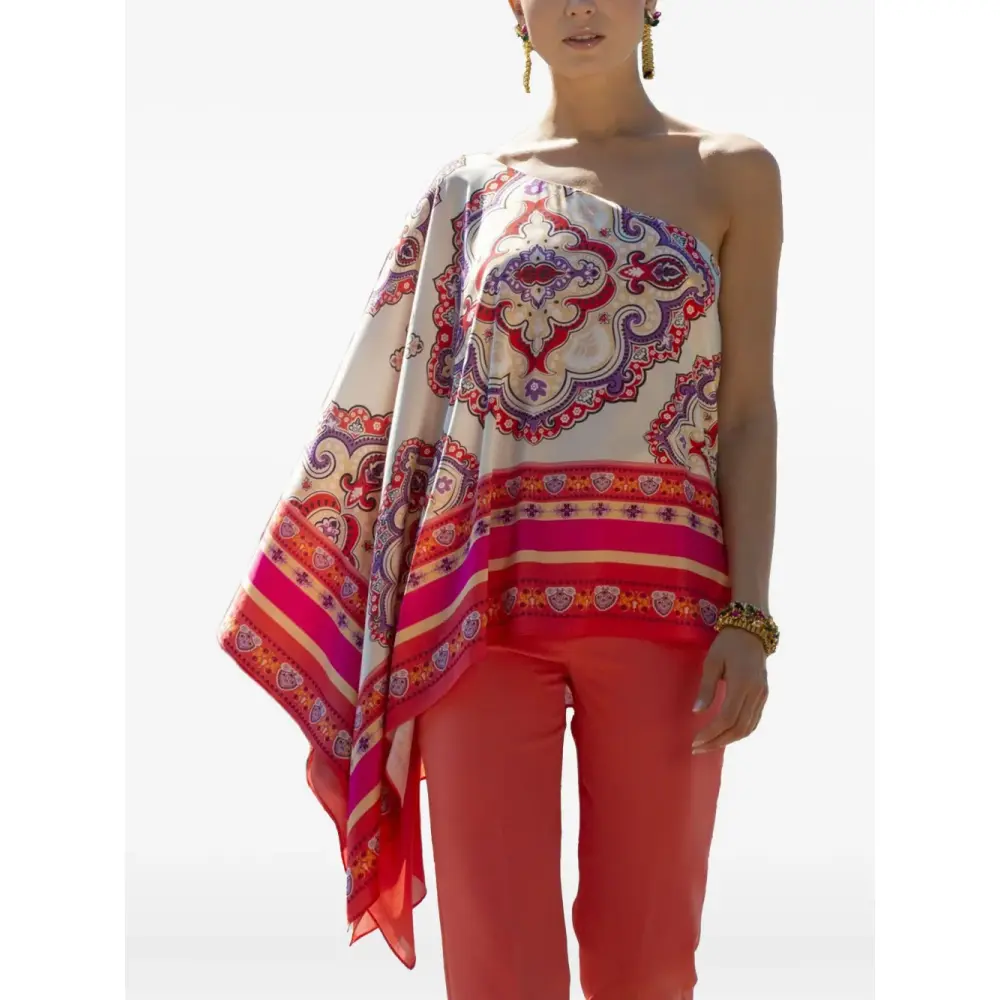 бежевый и красный, дизайн на одно плечо, узорчатая отделка по краю, драпированный дизайн, асимметричный подол