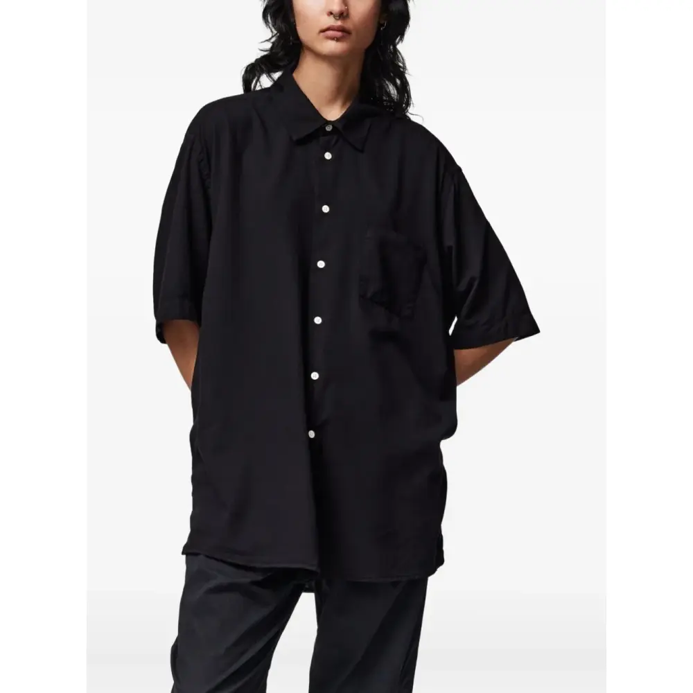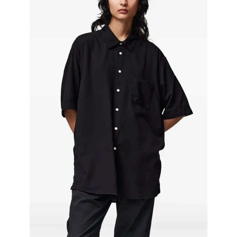 чёрная рубашка с нагрудным карманом, застёжкой на пуговицы, короткими рукавами и классическим воротником