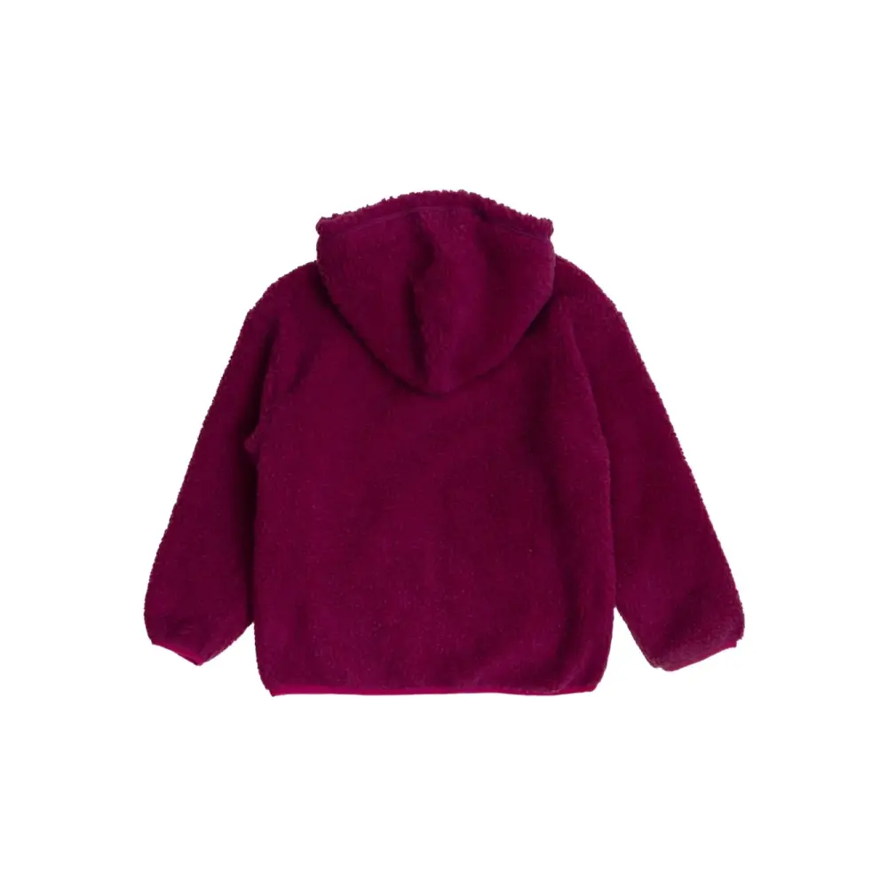 флисовая текстура цвета фуксии, несъёмный капюшон, застёжка на молнию, длинные рукава, нашивка с логотипом