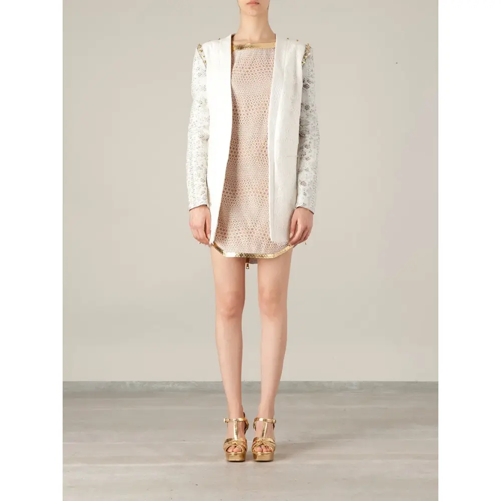 Белый блейзер из хлопкового, шёлкового с кожаным микса с вышивкой от Kristian Aadnevik. Открытый перед, молнии сбоку, золотистые заклёпки. Пожалуйста, обратите внимание, что эта вещь не может быть отправлена за пределы ЕС.