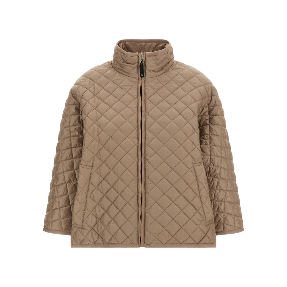 Короткая двусторонняя накидка «Delfina» из водонепроницаемого канваса, с утеплителем Cameluxe, стеганая ромбами с одной стороны и гладкая с другой, с отложным воротником, застежкой-молнией спереди и длинными рукавами-кимоно.
