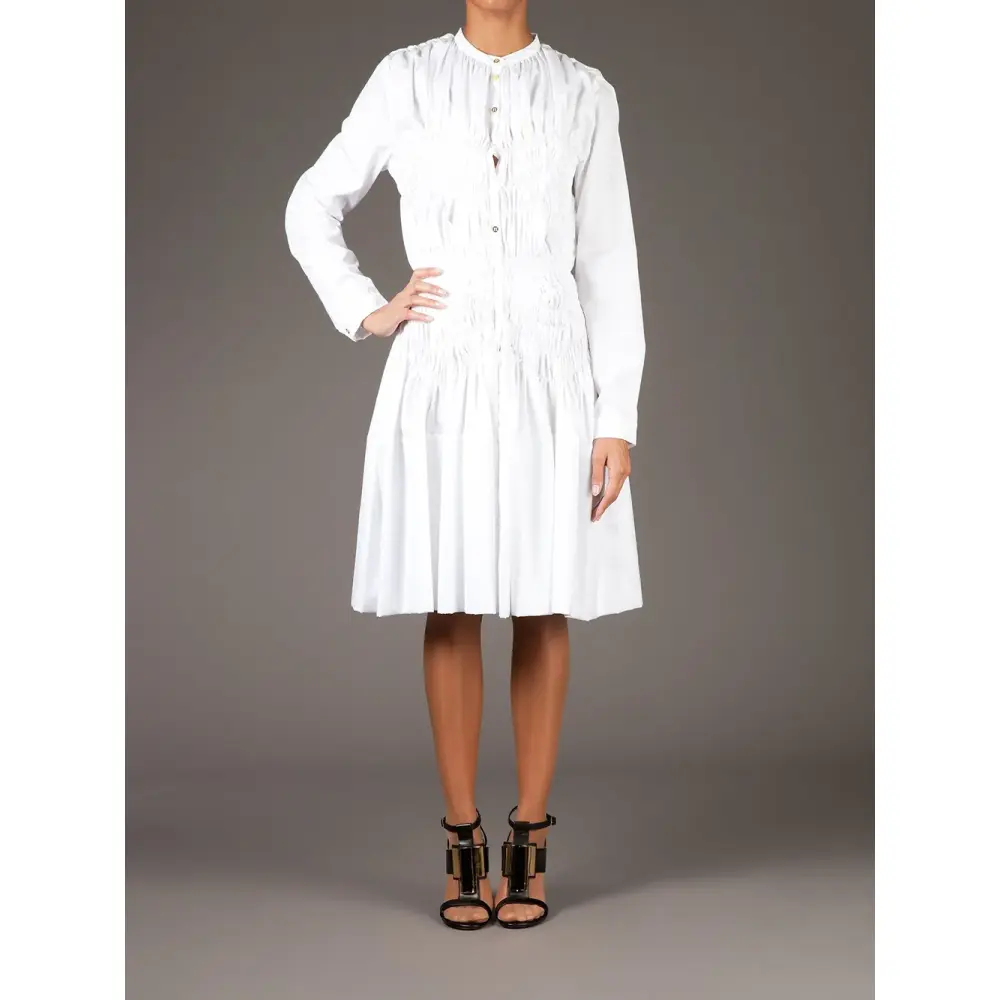 Ruche detail shirt dress от Maison Rabih Kayrouz. Воротник-стойка, дизайн со сборкой, застежка на пуговицах спереди, приталенный крой, плиссированный дизайн, длинные рукава и манжеты на пуговицах. Цвет: белый.