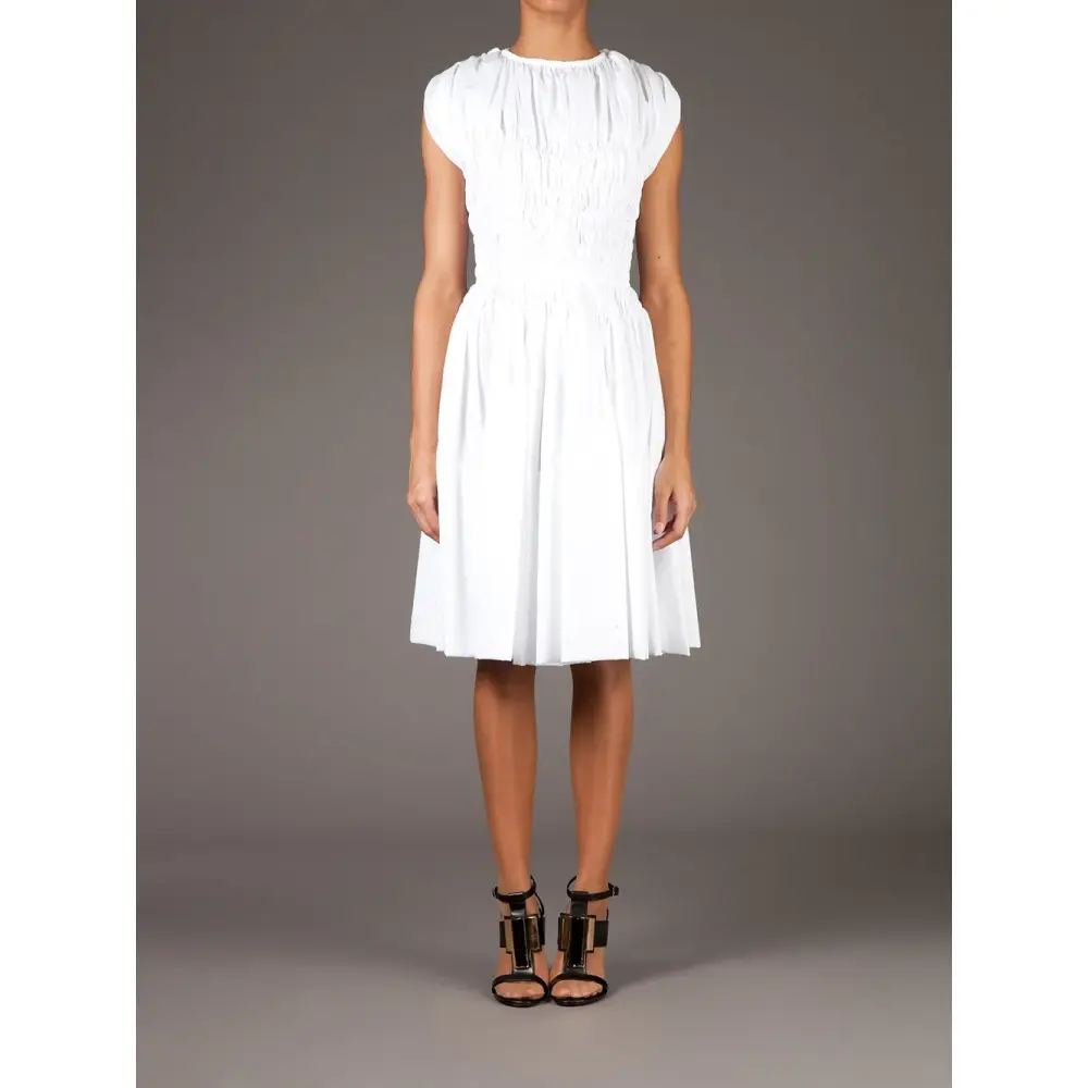 Ruched flared dress от Maison Rabih Kayrouz. Круглый вырез, дизайн со сборкой, приталенный крой, расклешенная юбка, деталь со складками и застежка на крючке сзади. Цвет: белый.