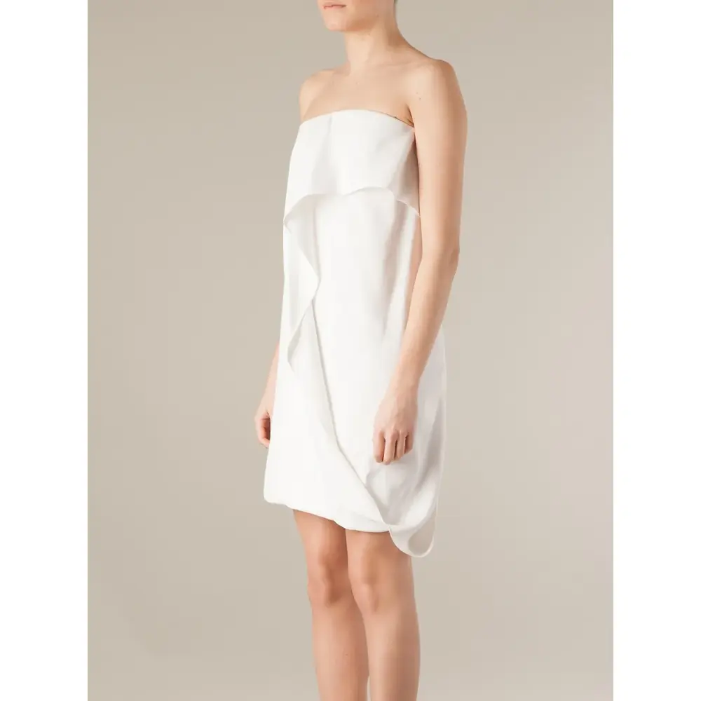 Белое платье-бандо с драпировкой от Maison Rabih Kayrouz. Драпированный дизайн, застёжка на молнии сзади.