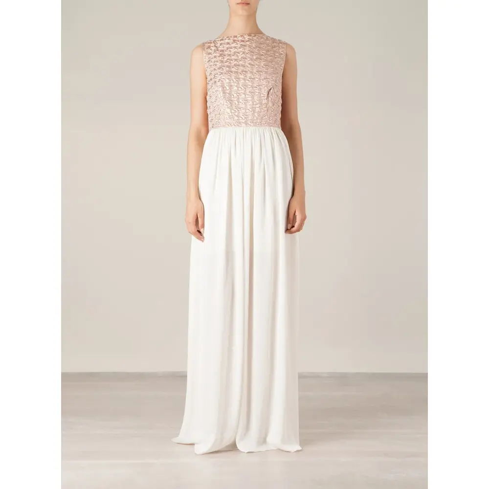 Нежно-розовое с белым вечернее платье из шёлкового микса без лямок от Maison Rabih Kayrouz. Слэш-вырез, дизайн без рукавов, приталенный крой, застёжка на молнии сзади.