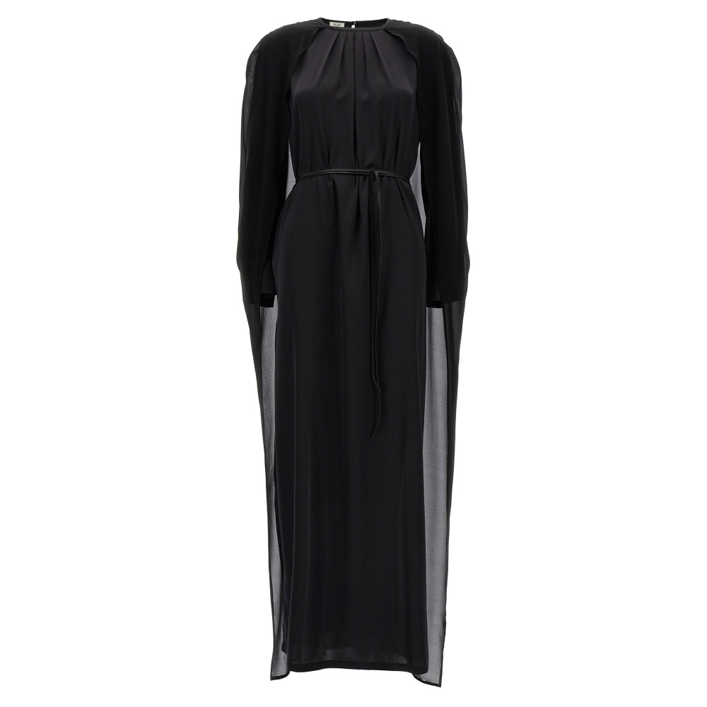 Платье-накидка из шелка, круглым вырезом, длинными рукавами, кожаным поясом на талии.