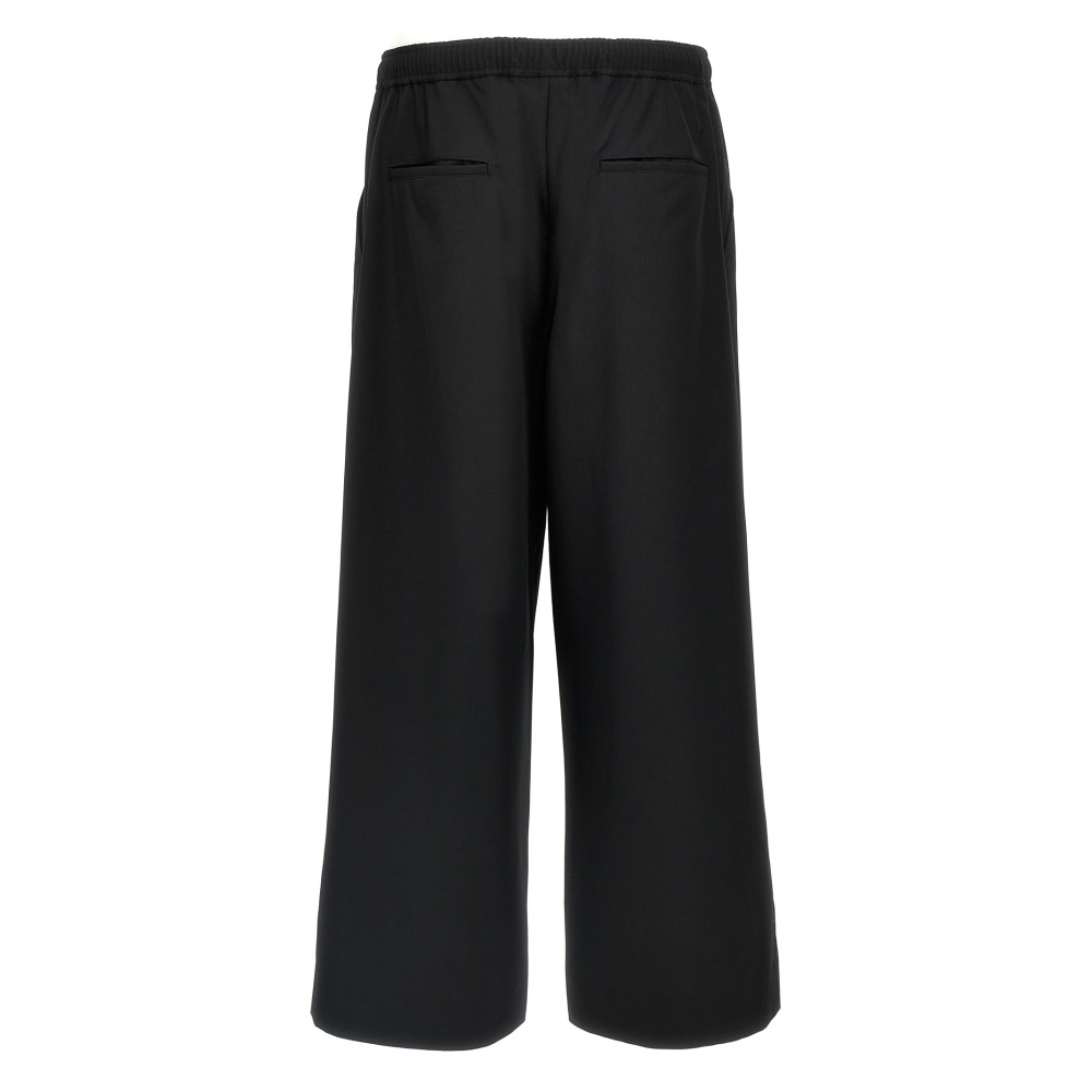 Шерстяные брюки, широкий и прямой крой, складки, эластичный пояс с регулируемым шнурком, карманы.