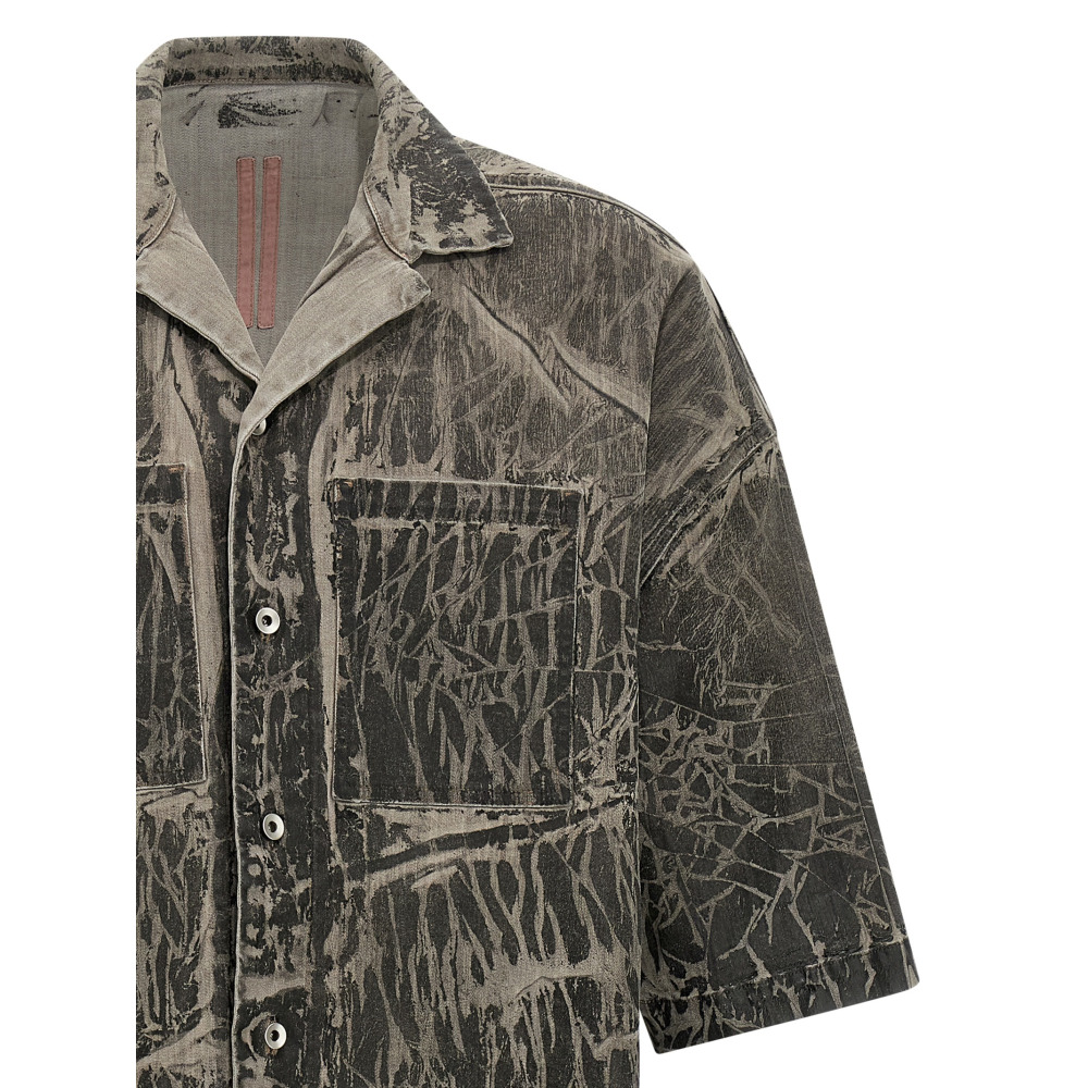 Рубашка 'Magnum Tommy' из хлопкового денима megacrust, окрашенного порошковым способом, с застежкой на пуговицы спереди, карманами, короткими рукавами со спущенной линией плеча, боковыми разрезами. Естественные особенности этой обработки приводят к неравномерному нанесению покрытия, его отслаиванию и растрескиванию в некоторых местах, что будет продолжаться по мере носки и трения. Это является неотъемлемой чертой такого типа обработки и является желаемым визуальным эффектом, который придает уникальность каждой вещи и не должен считаться дефектом.