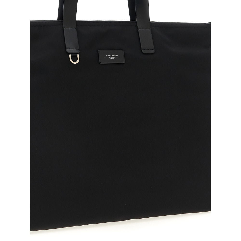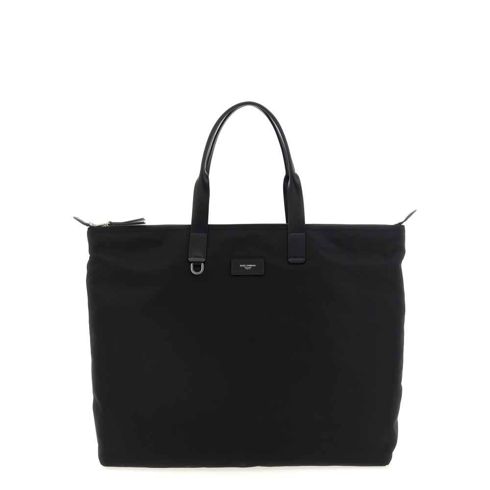 Большая нейлоновая сумка-шоппер с кожаными деталями в тон, нашивкой с логотипом и металлическим D-образным кольцом спереди, двумя фиксированными ручками и верхней застёжкой-молнией.
