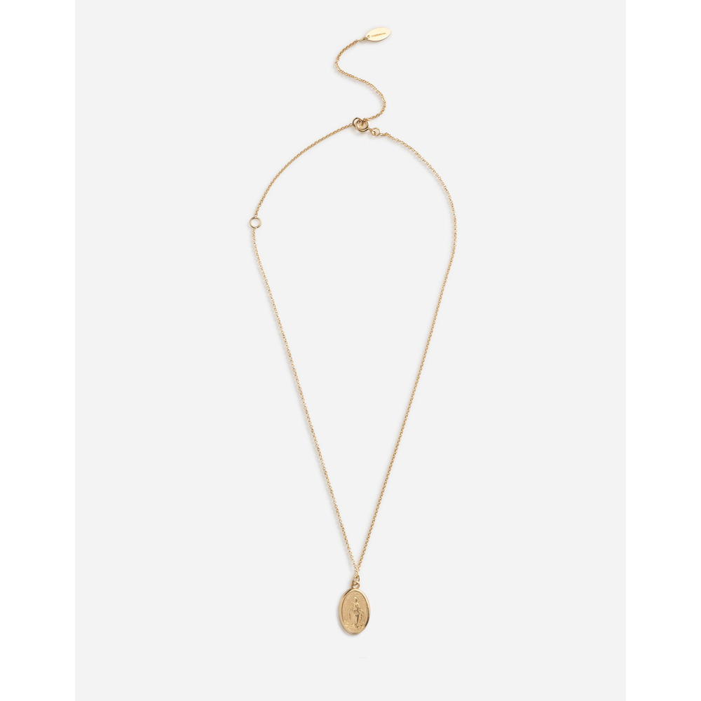 Ожерелье состоит из тонкой цепочки "ролò" из желтого золота и овального медальона, изображающего Вознесение Девы Марии. Овальная бирка с логотипом DOLCE&GABBANA размещена на конце удлиняющей цепочки.