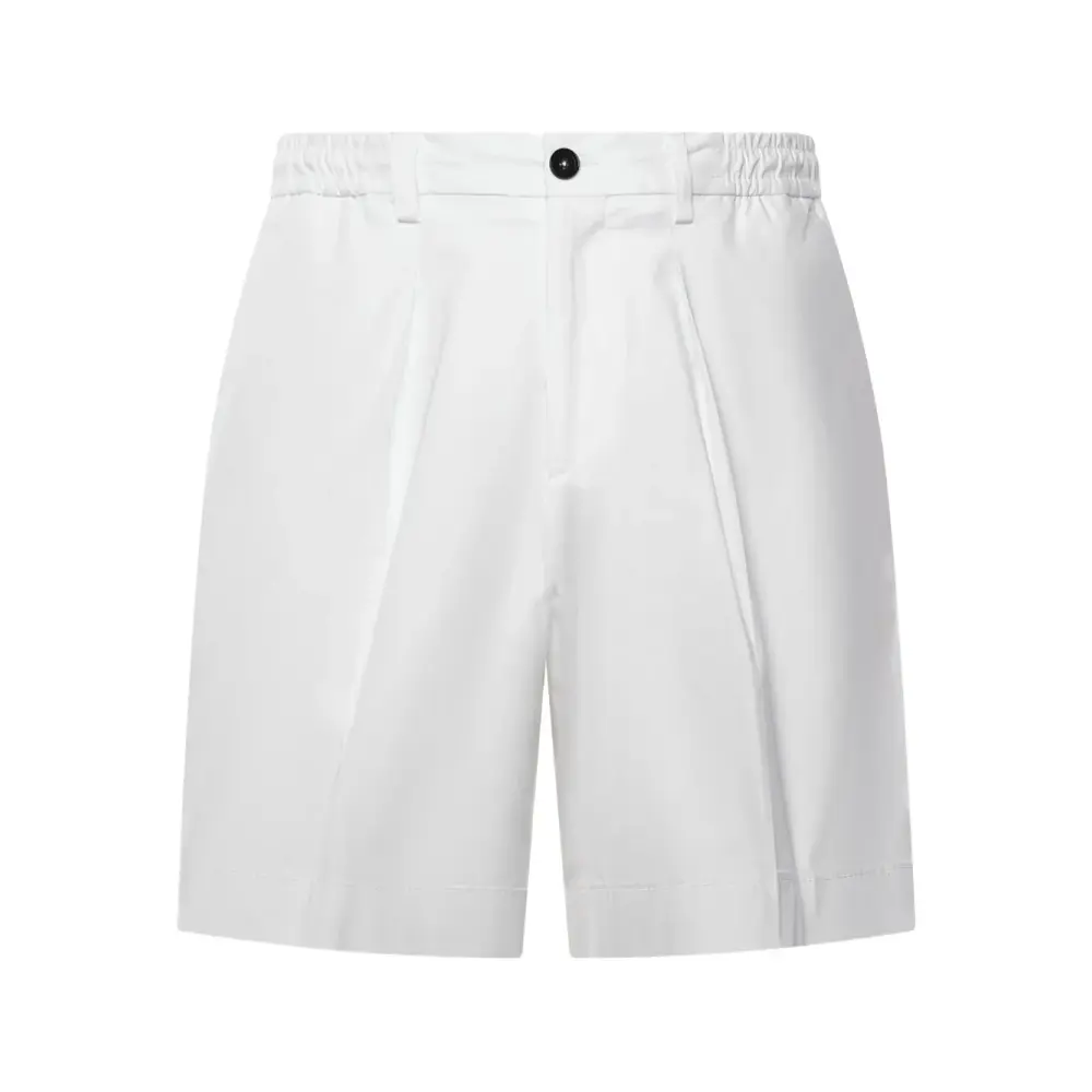 белые с защипами спереди, на эластичном поясе, застежка на пуговицу, шлевки для ремня, задние карманы