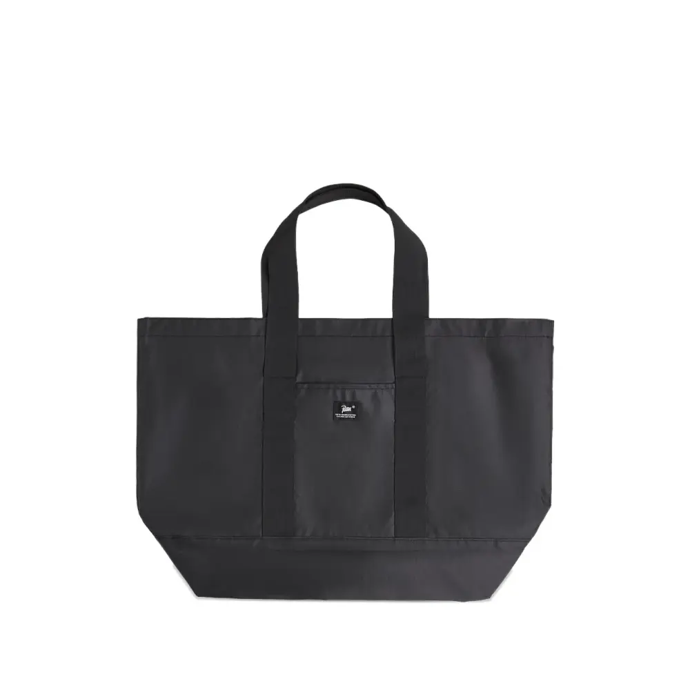 черная сумка с принтом логотипа, верхней ручкой и передним накладным карманом