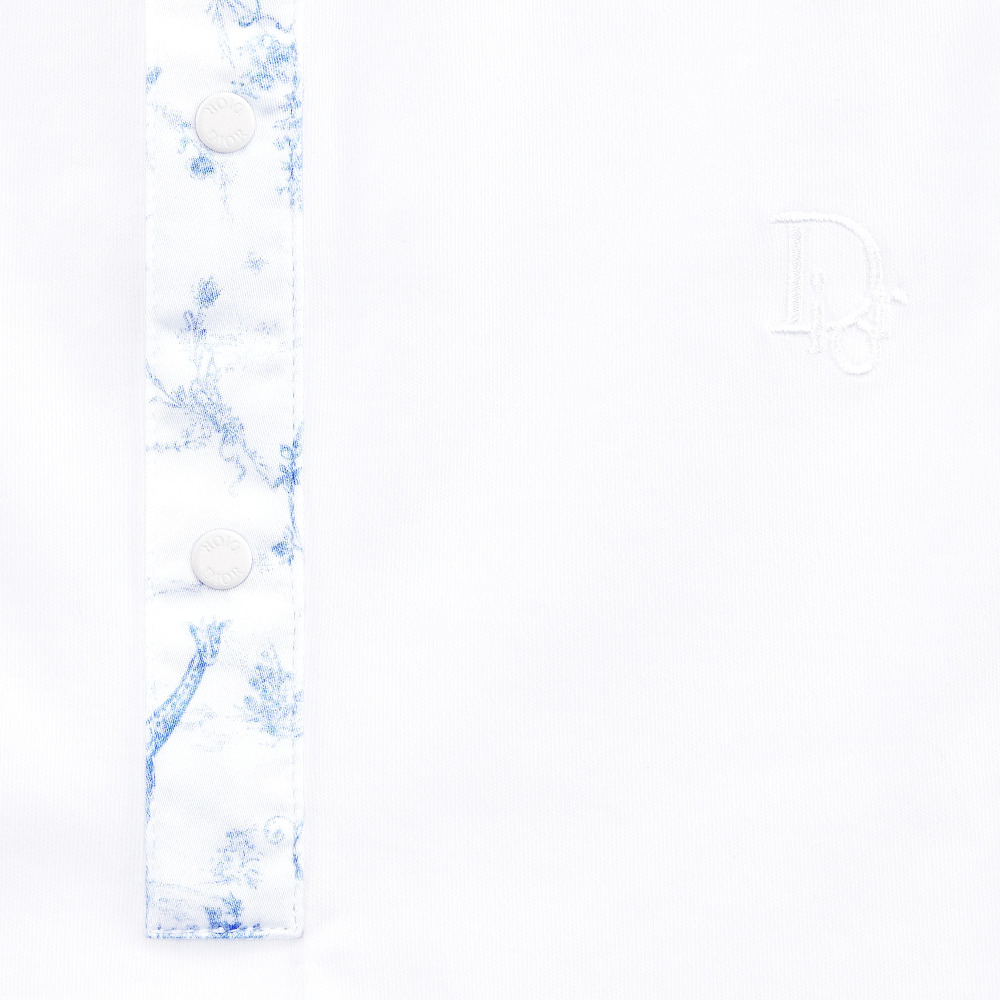 Подарочный набор для новорожденного украшен культовым мотивом Toile de Jouy Дома. Изготовленный из белого хлопкового интерлока, он состоит из пижамы, шапочки и слюнявчика, украшенных вставками из хлопкового сатина с голубым принтом. Пижама снабжена кнопками спереди и сзади для удобства переодевания, дополнена воротником Клодин и эластичными манжетами. Украшенный вышивкой Dior Oblique, этот набор станет идеальным подарком для новорожденного.