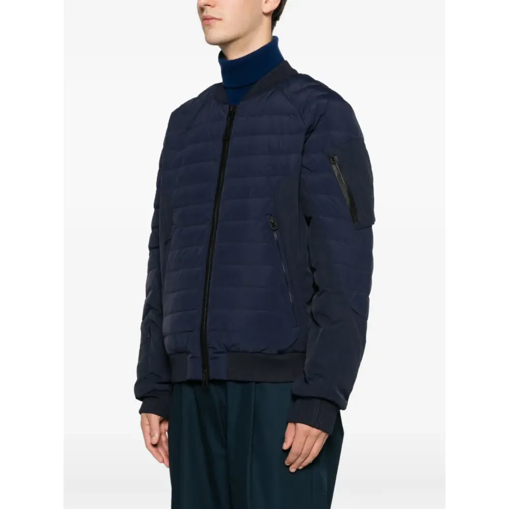 темно-синий цвет, стеганый дизайн, застежка-молния, карманы на молнии, ребристые манжеты