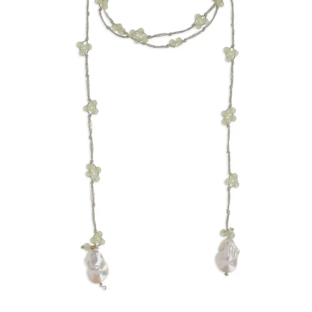 зеленые жемчужины на концах, детали из бусин. Жемчуг должен быть последним, что вы надеваете утром, и первым, что снимаете вечером. Избегайте контакта с парфюмерией или кремами, очищайте просто мягкой тканью.