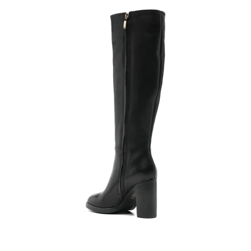 черные кожаные сапоги на высоком каблуке с круглым мыском, высоким голенищем и отделкой-швами