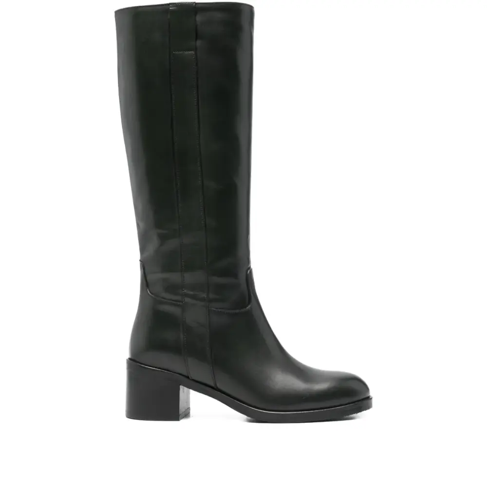 зеленые кожаные сапоги до колена на устойчивом каблуке, модель без застежки, с панельным дизайном