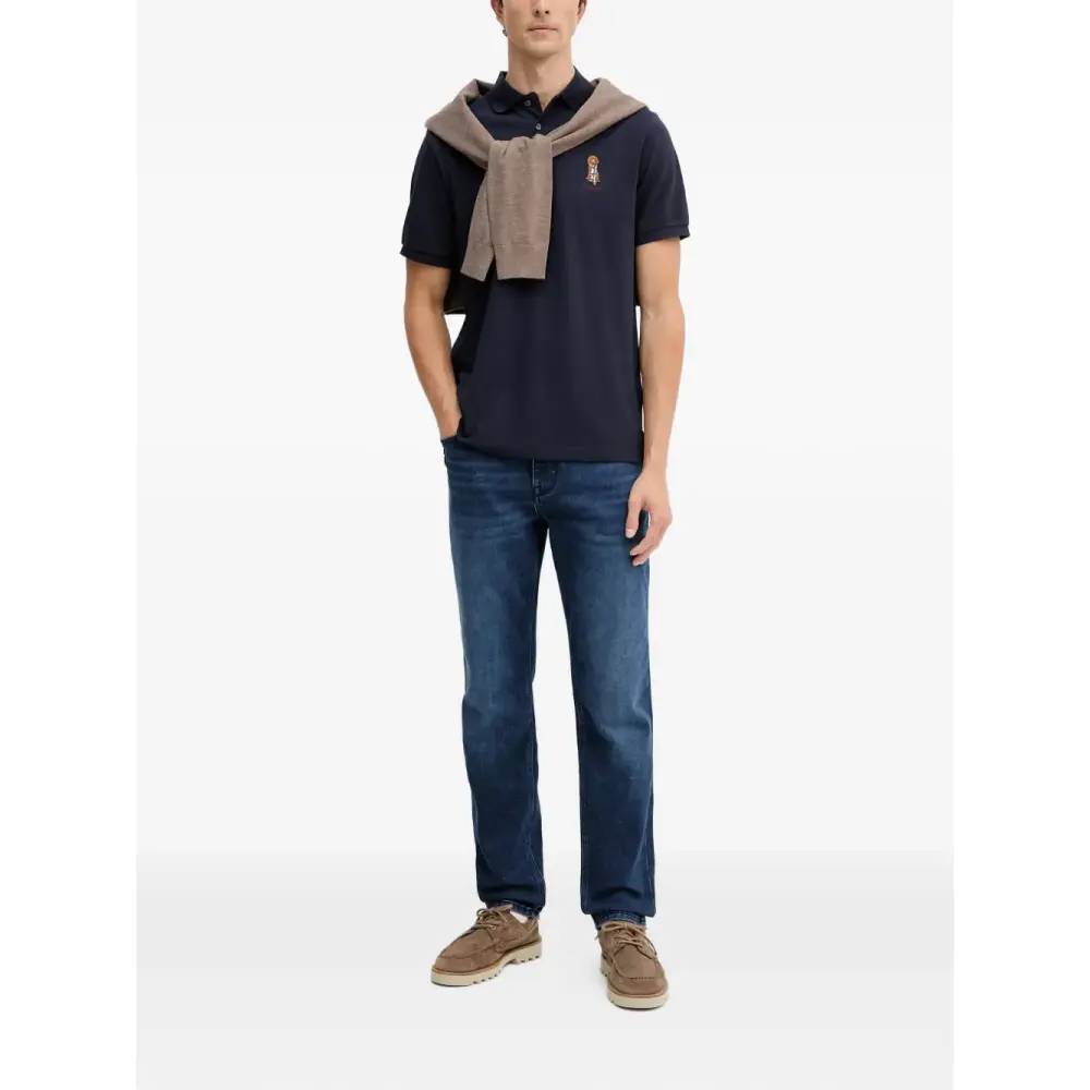 темно-синее поло с вышивкой, воротником, короткими рукавами и застёжкой на пуговицы