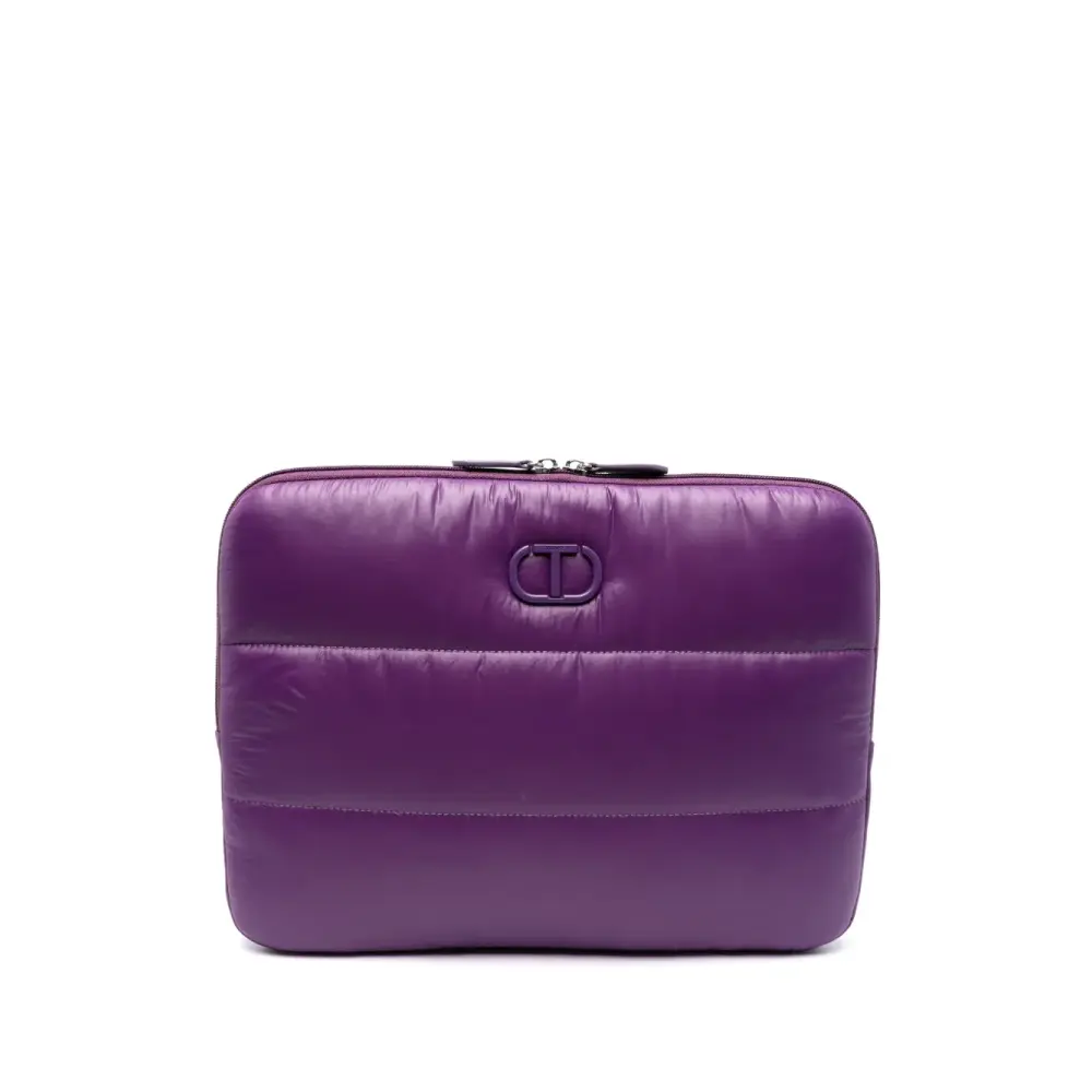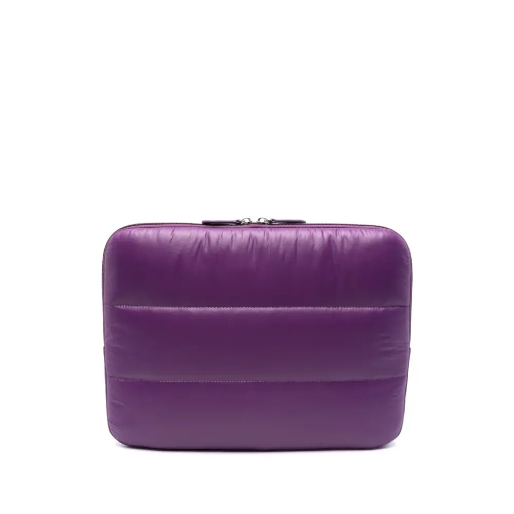 Фиолетовый, легкий материал, лакированное покрытие, дутый материал, логотип в тон, круговая молния, нашивка с логотипом внутри и цельная подкладка.