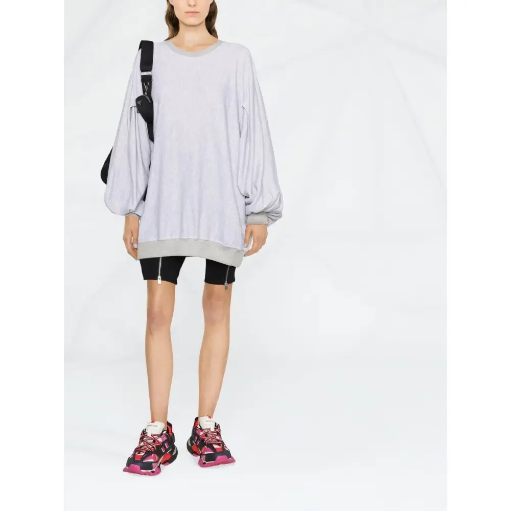 Светло-серый, хлопок, круглый вырез, приспущенные плечи, объемные рукава, манжеты в рубчик и подол в рубчик.