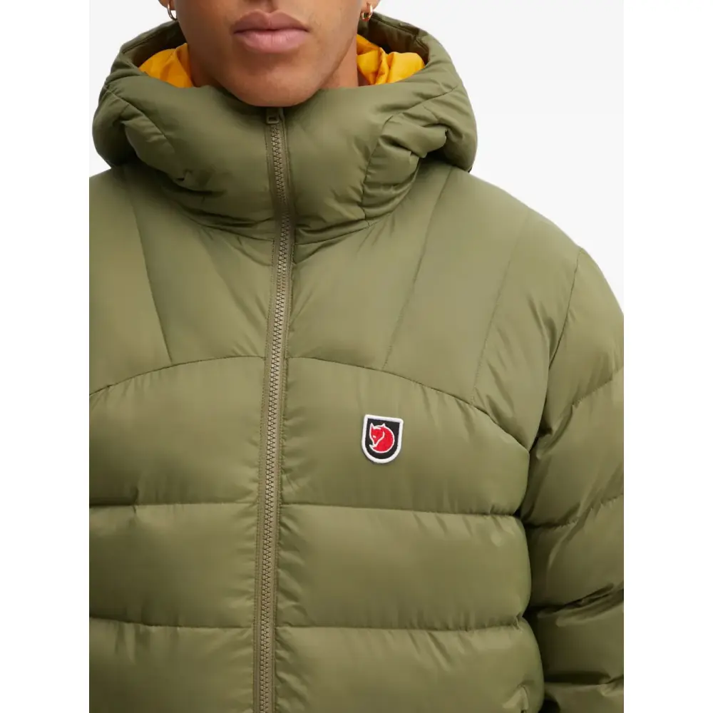 оливково-зеленый пуховый дизайн, капюшон, застежка-молния, нашивка с логотипом, горизонтальная стежка