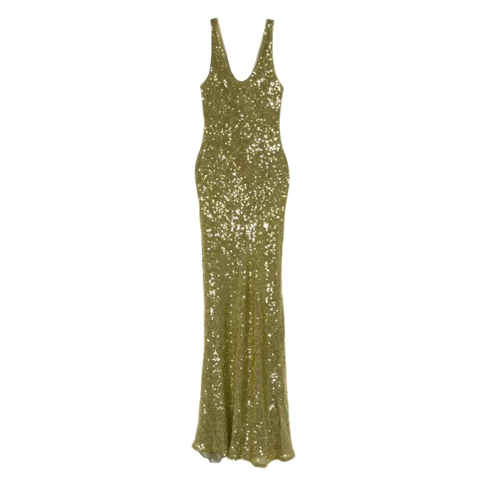 оливково-зеленое платье в пол без рукавов с V-образным вырезом, украшенное пайетками
