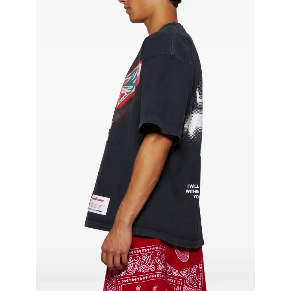 черная футболка с графическим принтом, круглым вырезом, короткими рукавами и фирменной нашивкой