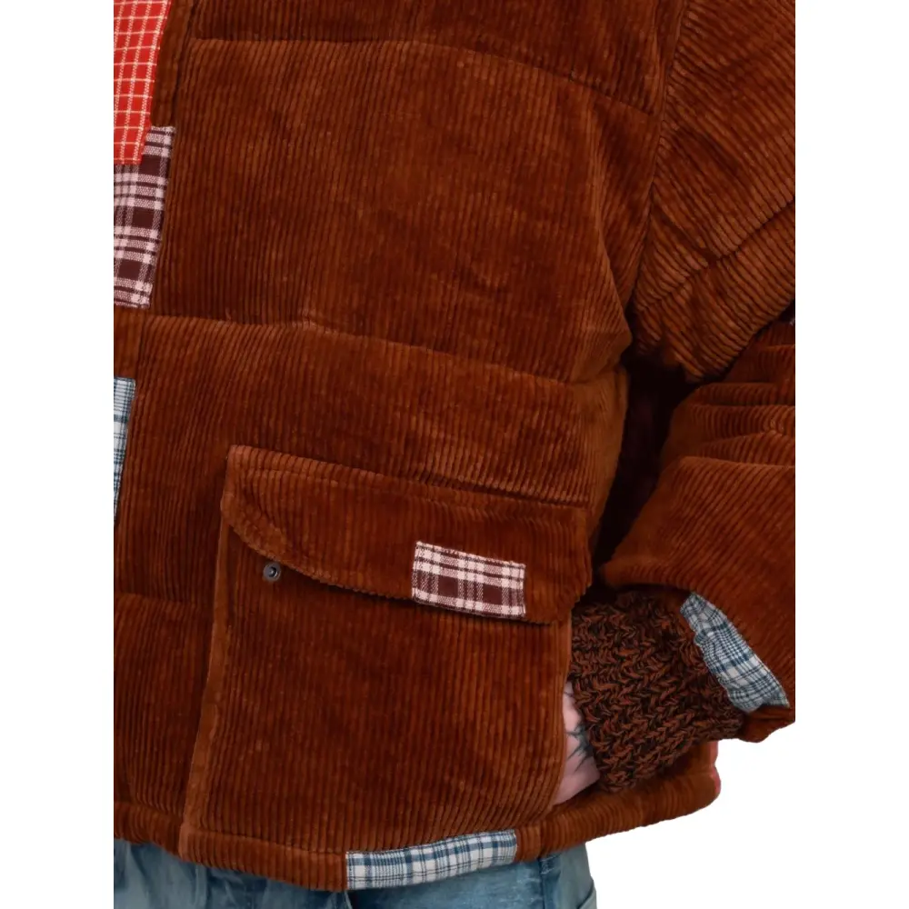 коричневая вельветовая ткань, детали в стиле пэчворк, накладные карманы спереди с клапанами, манжеты в рубчик