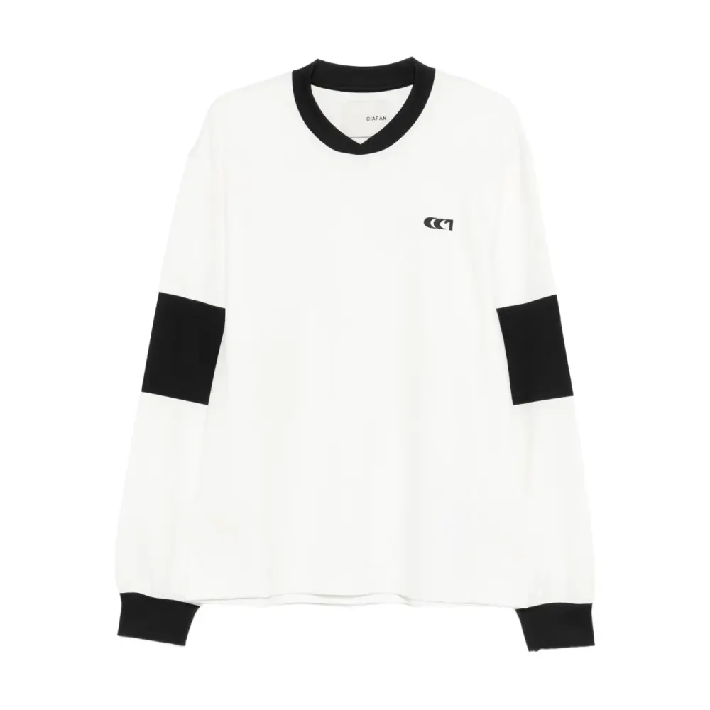 белый свитер с круглым вырезом, длинными рукавами, контрастными вставками на рукавах, ребристыми краями, трикотажной вязкой