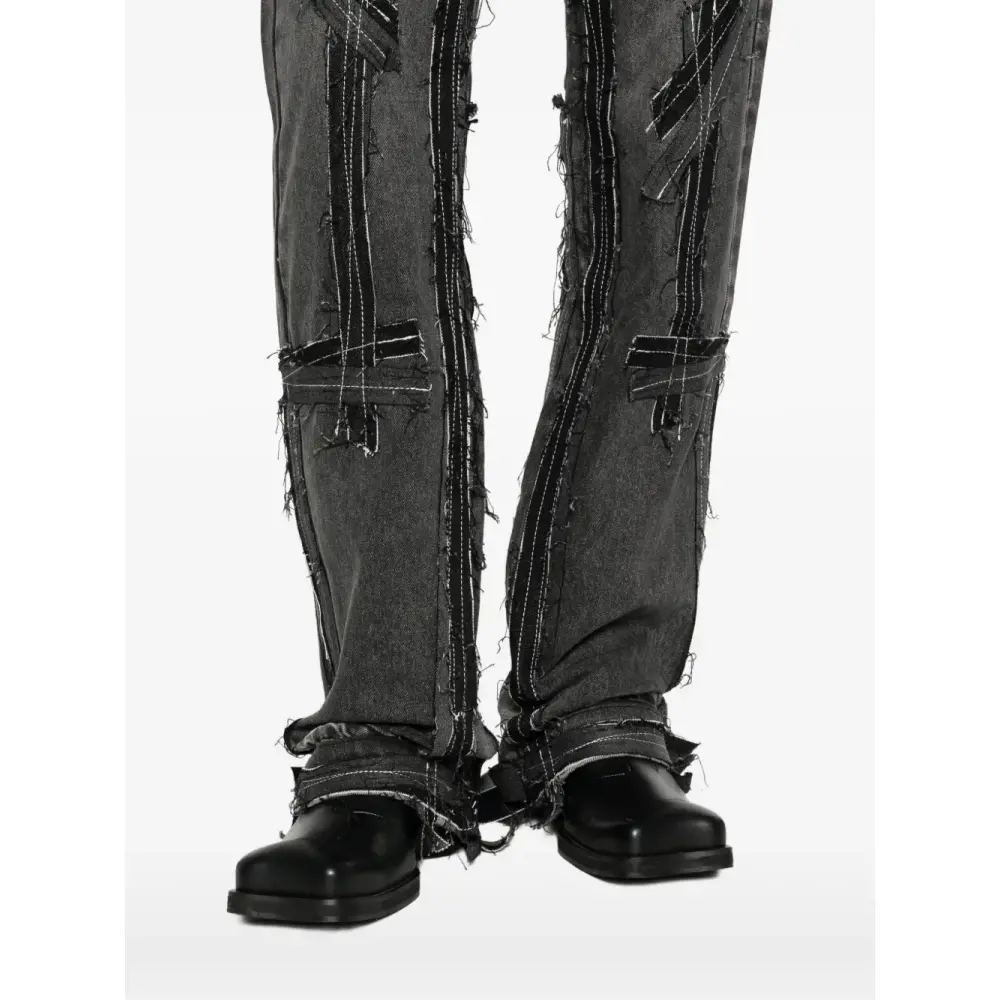 серый цвет, необработанные края, сшитые панели, швы, прямые брючины, пять карманов