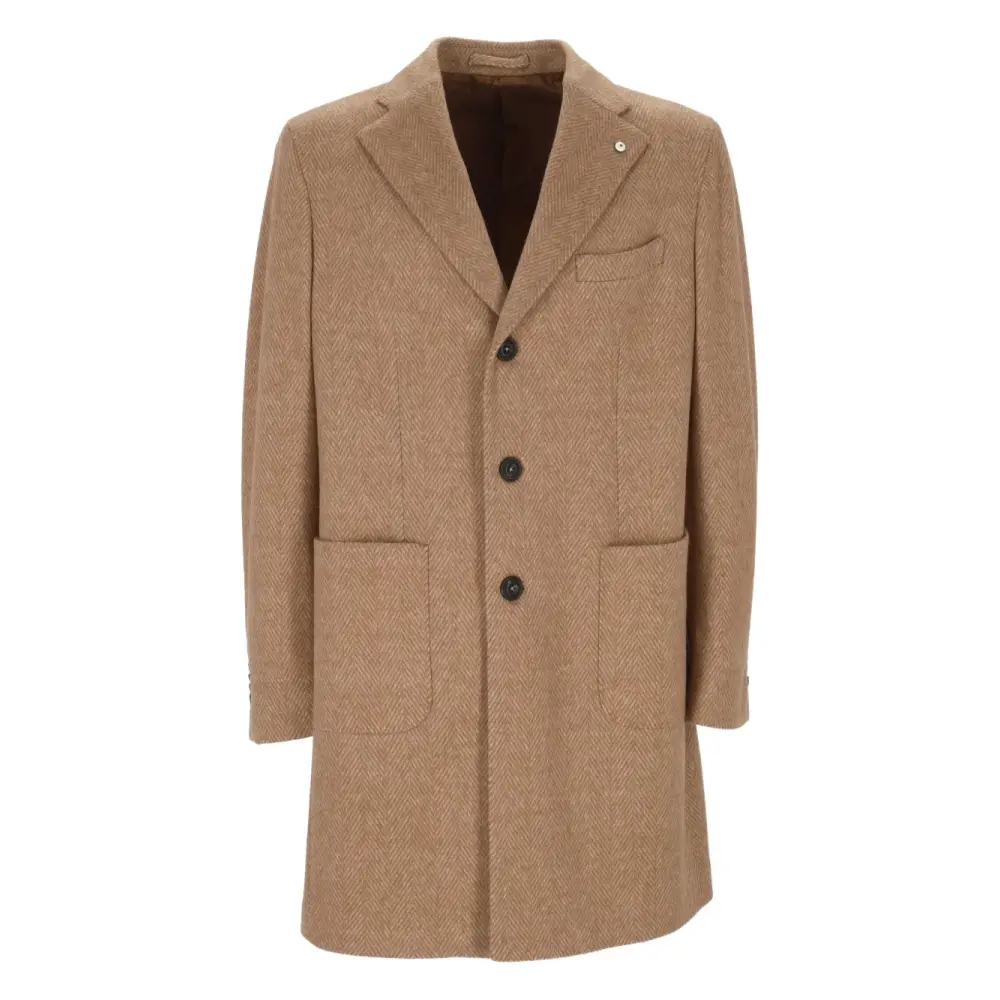 коричневый цвет, узор "ёлочка", застёжка на пуговицы, лацканы с вырезом, нагрудный прорезной карман, накладные карманы