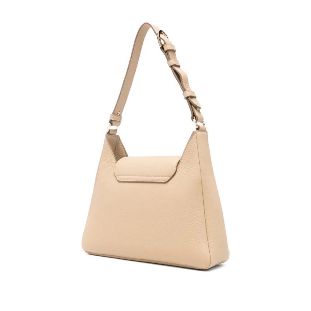 светло-бежевый цвет, фурнитура золотистого оттенка, регулируемый плечевой ремень, застежка-защёлка, внутренний накладной карман. В комплекте защитный мешочек для хранения.