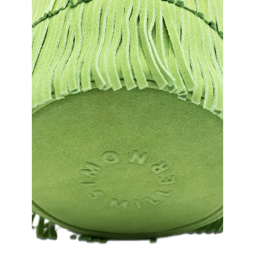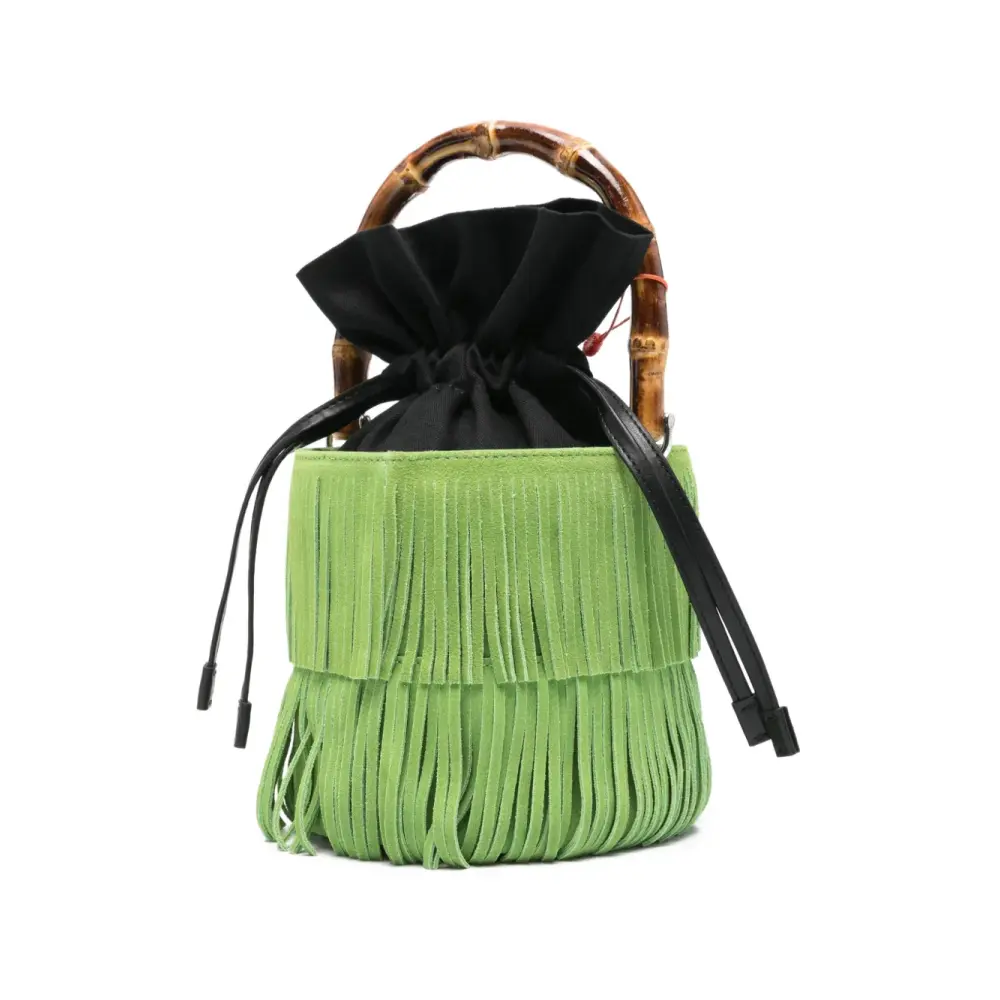 зелёная сумка с бахромой, застёжкой-кулиской и верхней ручкой