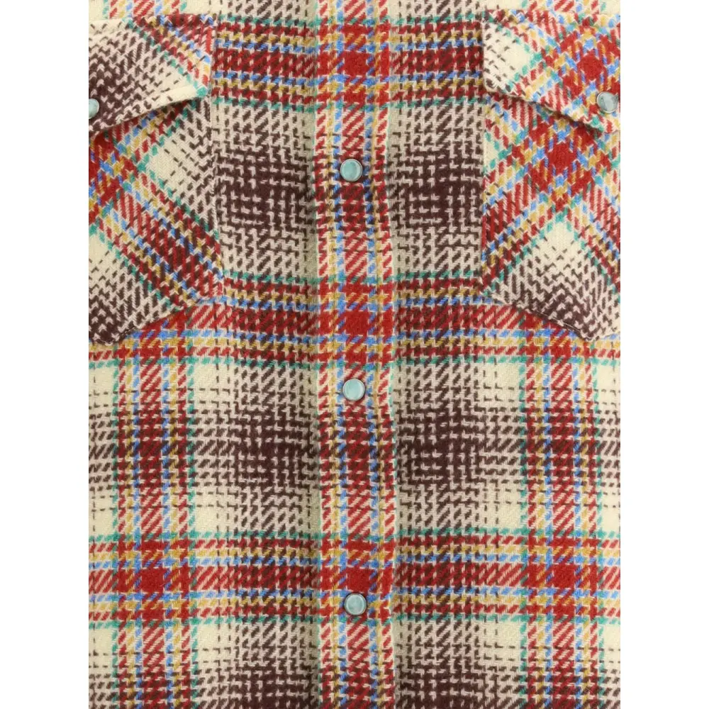 бежевый и разноцветный тартановый узор, застёжка на пуговицы, нагрудные карманы, отложной воротник, длинные рукава
