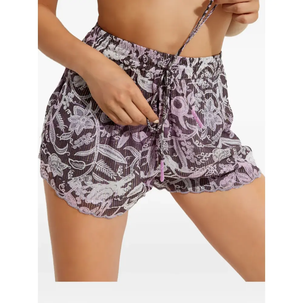фиолетовый с цветочным принтом, эластичный пояс, зубчатый край, застёжка на кулиску