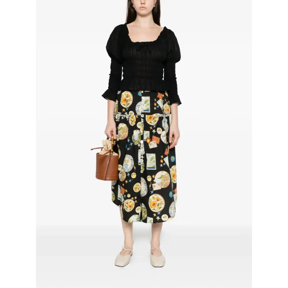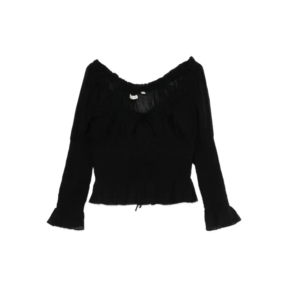 черная блузка с присборенными деталями, вырезом-лодочка, завязками, длинными рукавами и рифлеными манжетами