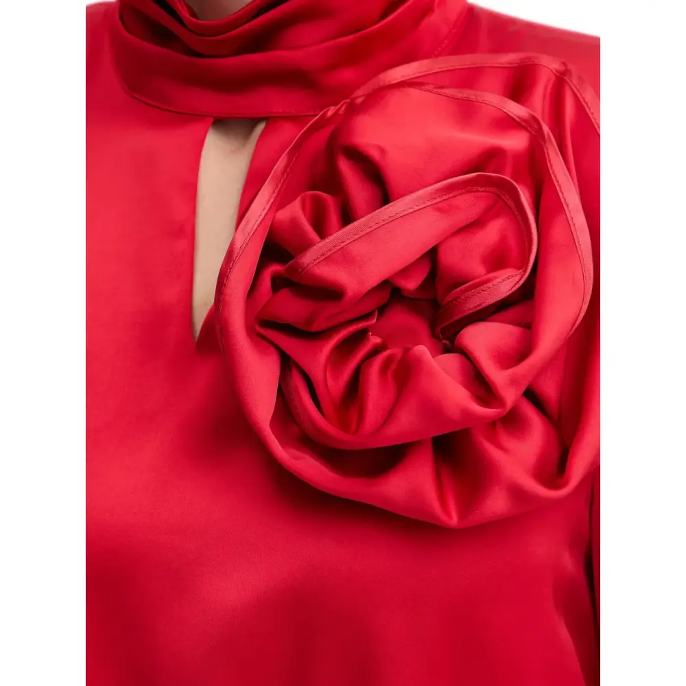 красное платье с цветочным декором, высоким воротником, манжетами на пуговицах и плиссированной юбкой