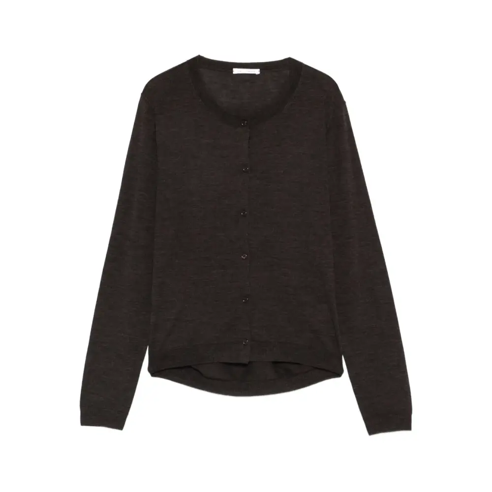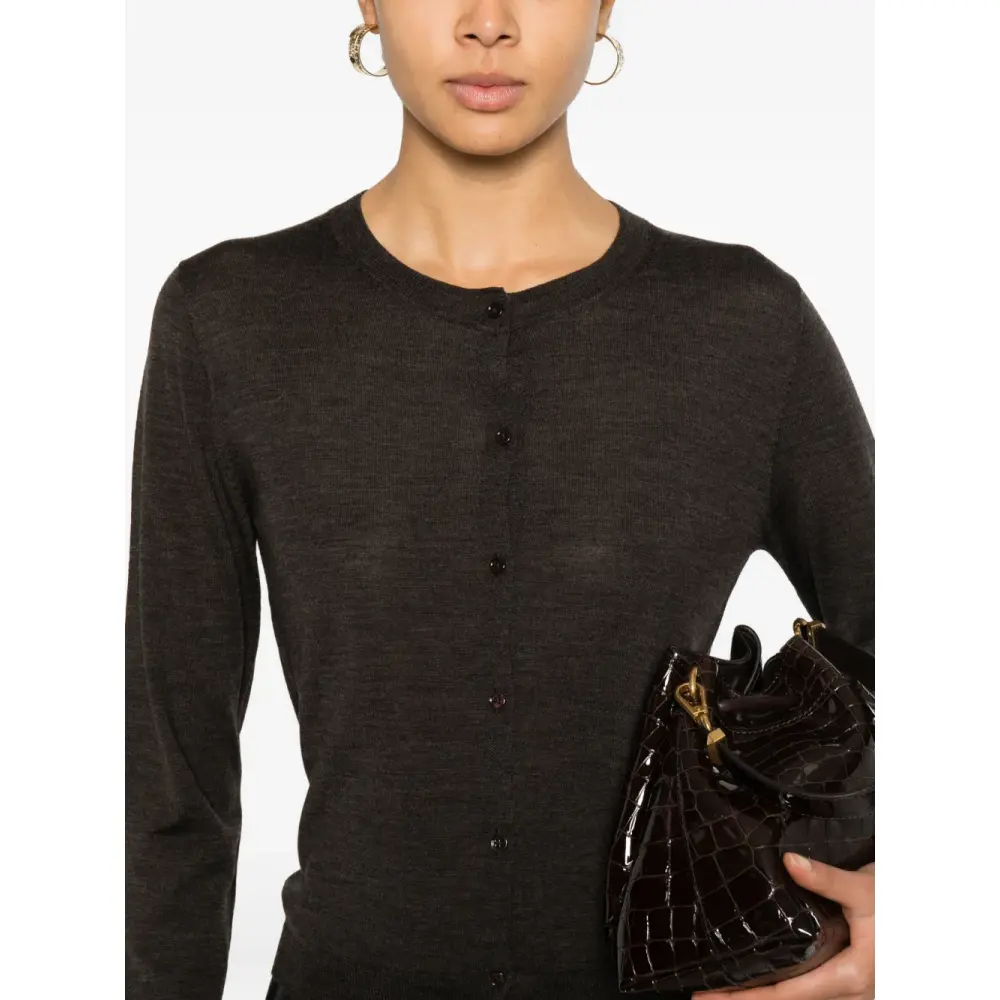 коричневый свитер с круглым вырезом, длинными рукавами, застежкой на пуговицы, ребристыми отделками и прямым подолом