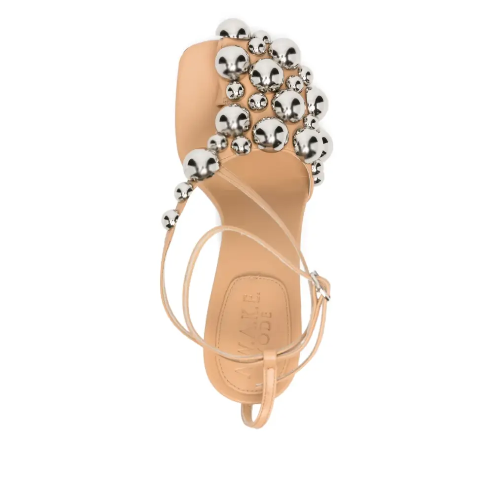 Бежевые босоножки с заклёпками, ремешком на щиколотке, открытым носком и каблуком-кирпичиком. В комплекте идет защитный чехол.