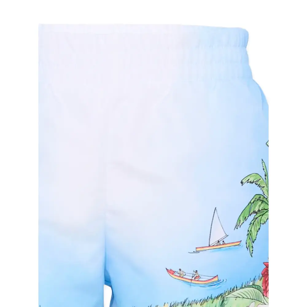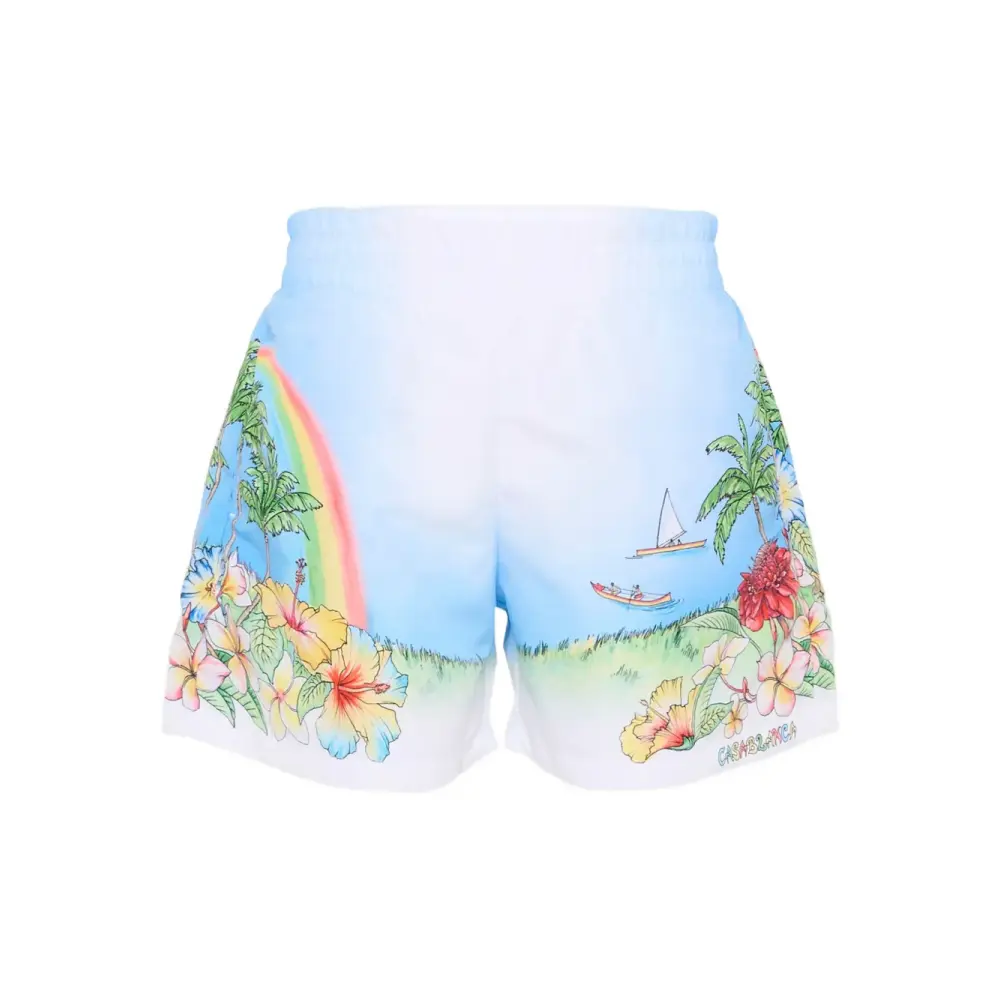 голубые с цветочным принтом, радужной отделкой и эластичным поясом