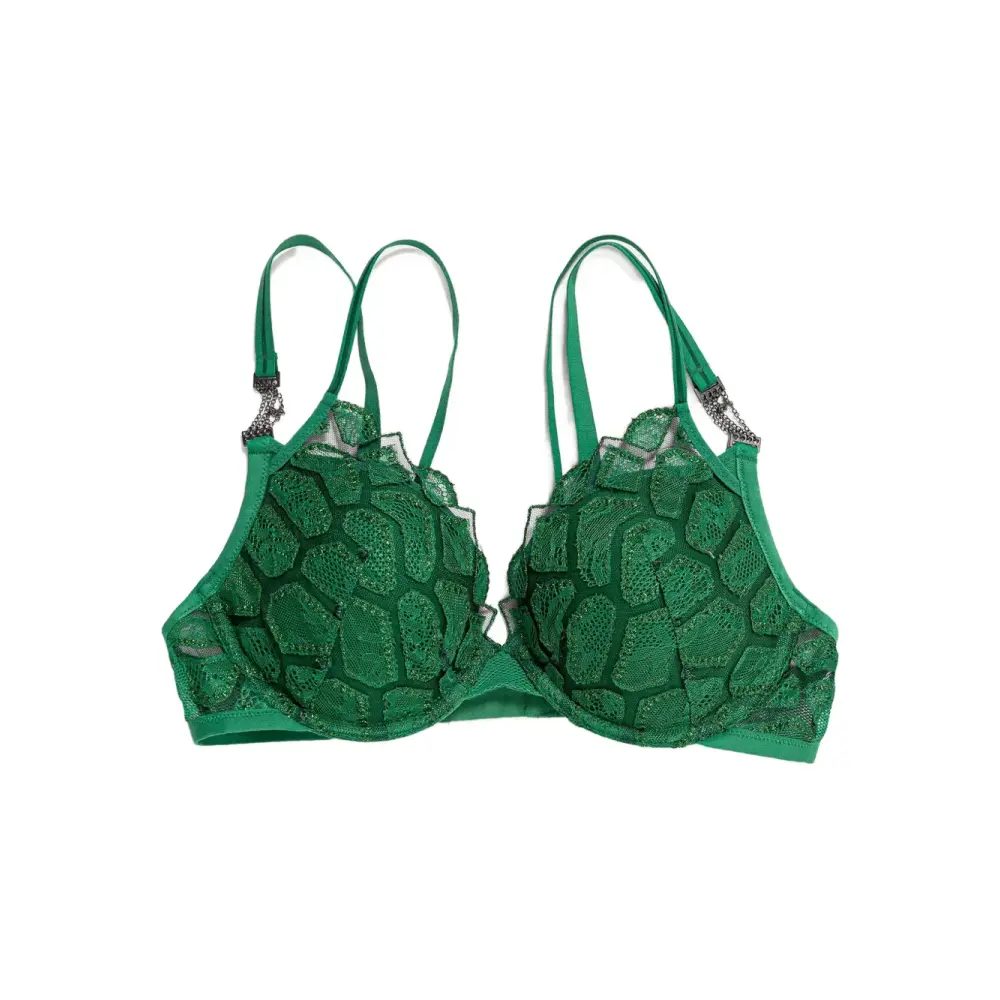 зеленый с кружевной отделкой, зубчатым краем, регулируемыми бретелями, застежкой сзади, вставками из сетки