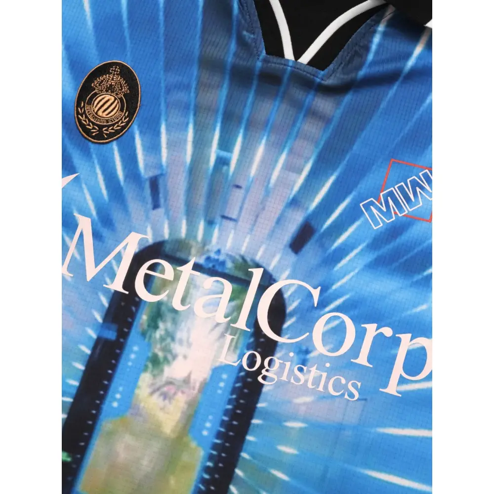 синий мотив с логотипом, классический воротник, отделка в рубчик