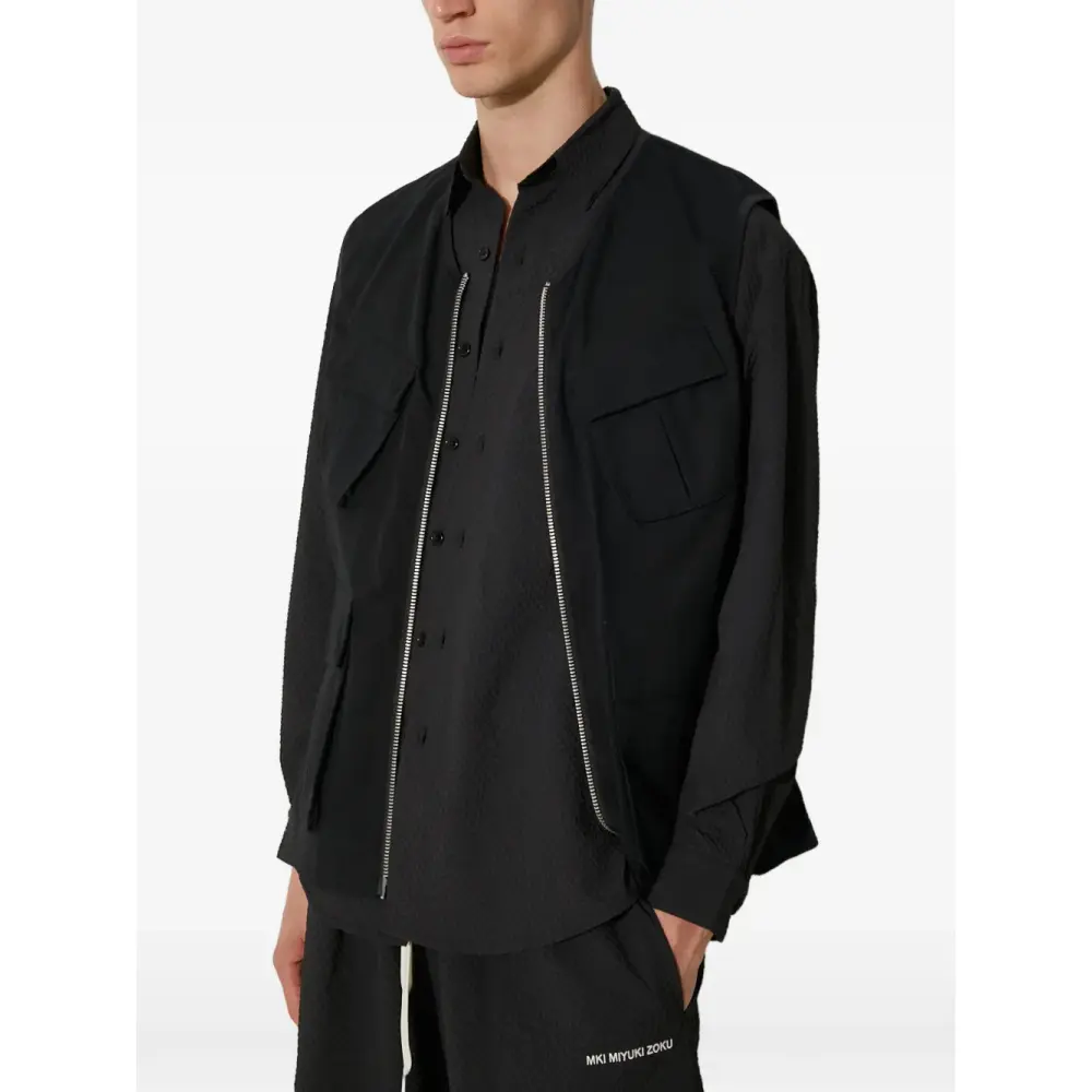 черная фактурная ткань рипстоп, множество карманов, застежка на молнию, воротник, панельный дизайн